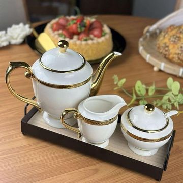 Conjunto Porcelana Chá Branco Borda Dourada Mesa Posta