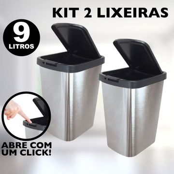 Kit 2 Lixeiras Cesto de Lixo 9 Litros Com Tampa Click Para Banheiro - Plástico Metalizado (Inox)